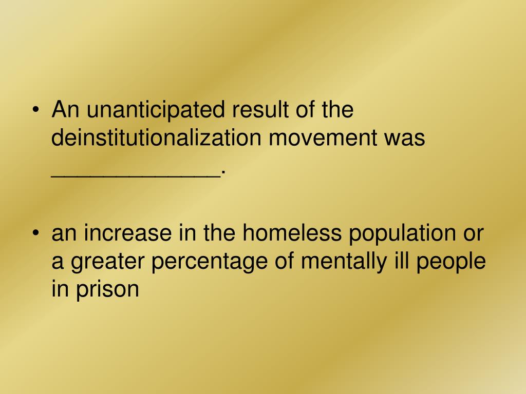 An unanticipated result of the deinstitutionalization movement was _____________. • an increase in the homeless population or a greater percentage of mentally ill people in prison