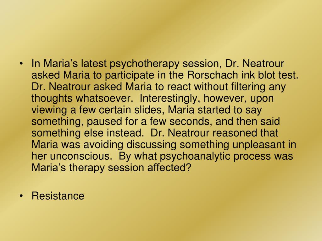 In Maria’s latest psychotherapy session, Dr. Neatrour asked Maria to participate in the Rorschach ink blot test. Dr. Neatrour asked Maria to react without filtering any thoughts whatsoever. Interestingly, however, upon viewing a few certain slides, Maria started to say something, paused for a few seconds, and then said something else instead. Dr. Neatrour reasoned that Maria was avoiding discussing something unpleasant in her unconscious. By what psychoanalytic process was Maria’s therapy session affected? • Resistance