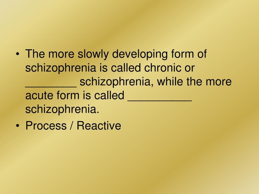 The more slowly developing form of schizophrenia is called chronic or ________ schizophrenia, while the more acute form is called __________ schizophrenia. • Process / Reactive