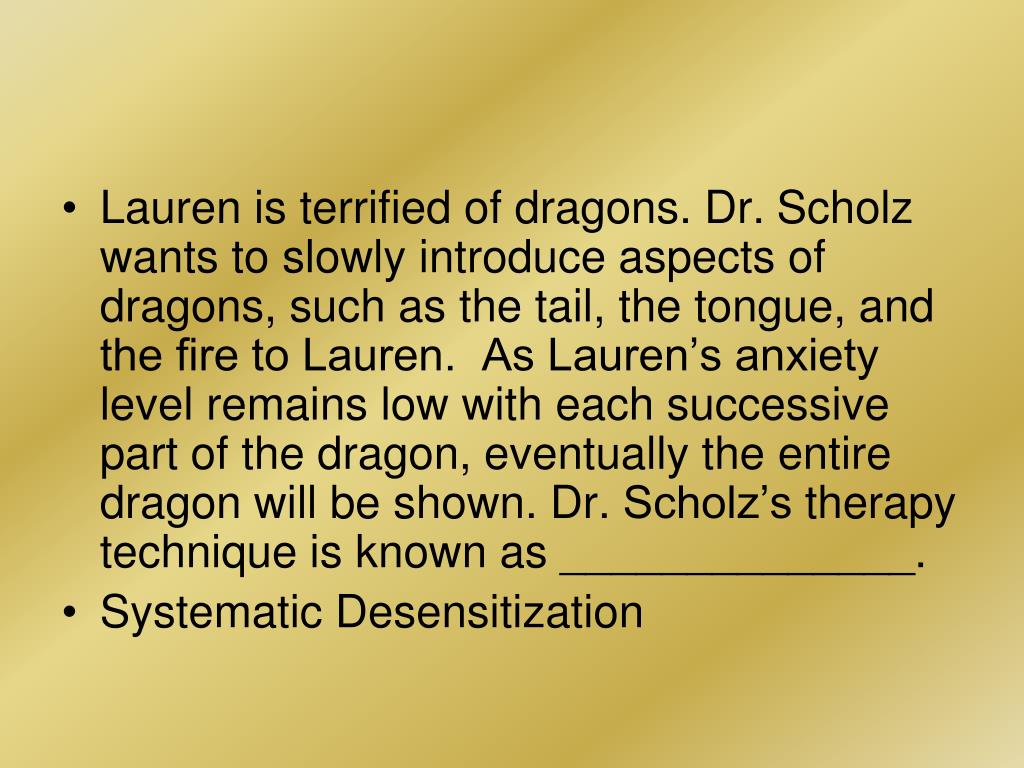 Lauren is terrified of dragons. Dr. Scholz wants to slowly introduce aspects of dragons, such as the tail, the tongue, and the fire to Lauren. As Lauren’s anxiety level remains low with each successive part of the dragon, eventually the entire dragon will be shown. Dr. Scholz’s therapy technique is known as ______________. • Systematic Desensitization