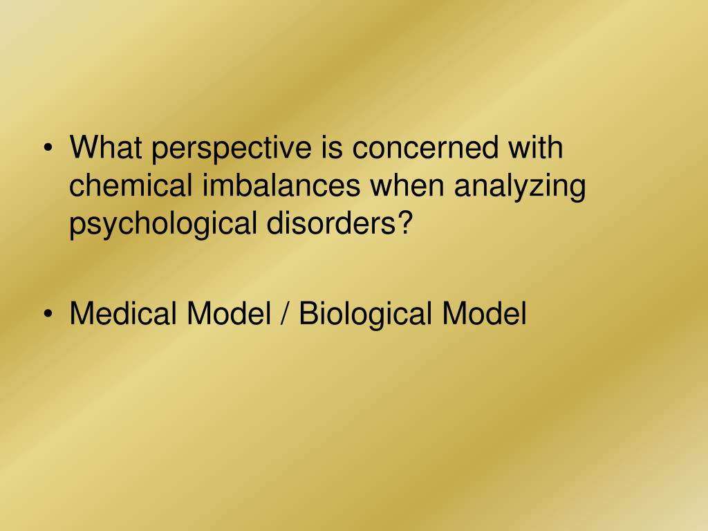 What perspective is concerned with chemical imbalances when analyzing psychological disorders? • Medical Model / Biological Model