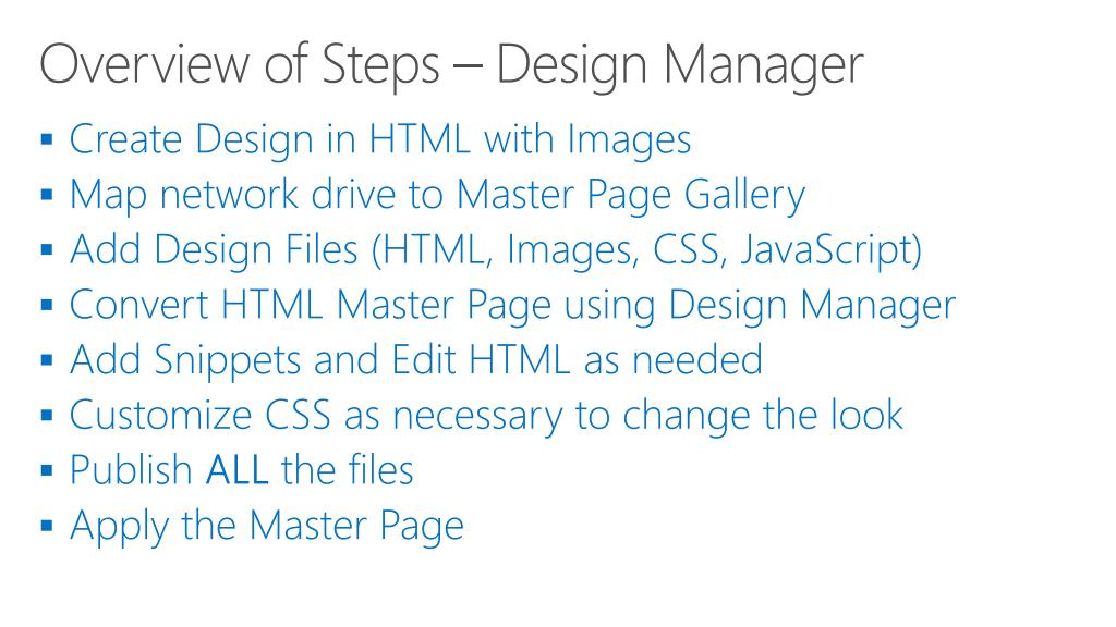 Overview of Steps – Design Manager • Create Design in HTML with Images • Map network drive to Master Page Gallery • Add Design Files (HTML, Images, CSS, JavaScript) • Convert HTML Master Page using Design Manager • Add Snippets and Edit HTML as needed • Customize CSS as necessary to change the look • Publish ALL the files • Apply the Master Page