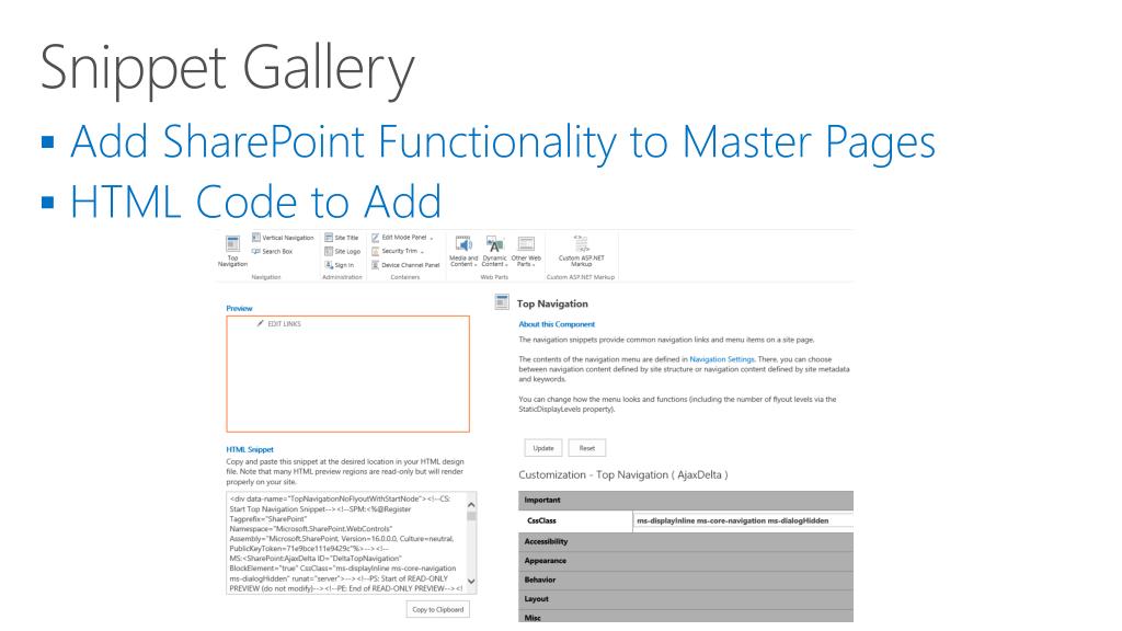Snippet Gallery • Add SharePoint Functionality to Master Pages • HTML Code to Add