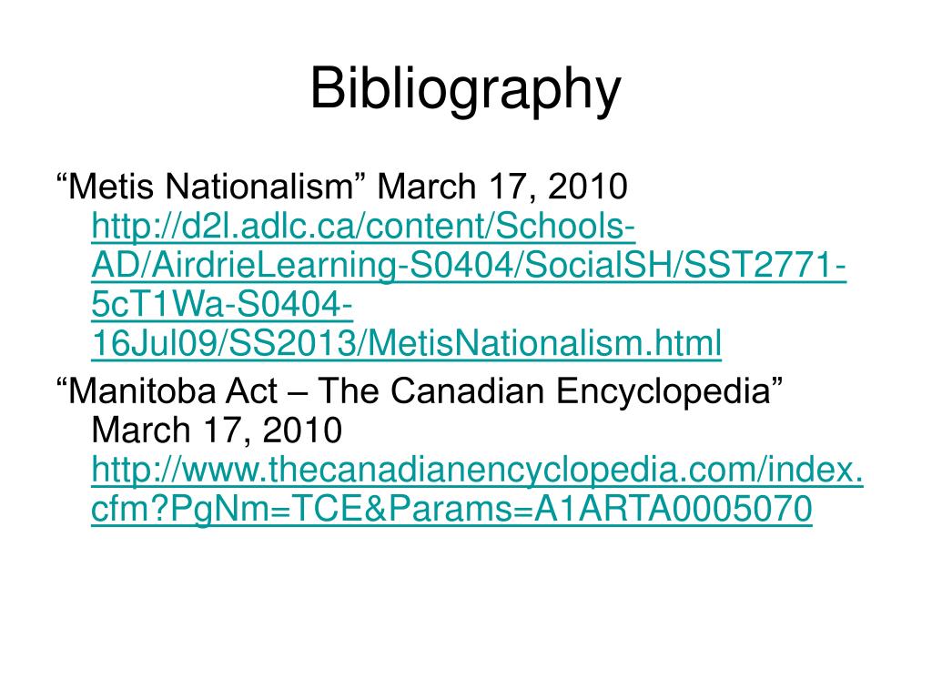 Bibliography “Metis Nationalism” March 17, 2010 http://d2l.adlc.ca/content/Schools-AD/AirdrieLearning-S0404/SocialSH/SST2771-5cT1Wa-S0404-16Jul09/SS2013/MetisNationalism.html “Manitoba Act – The Canadian Encyclopedia” March 17, 2010 http://www.thecanadianencyclopedia.com/index.cfm?PgNm=TCE&Params=A1ARTA0005070