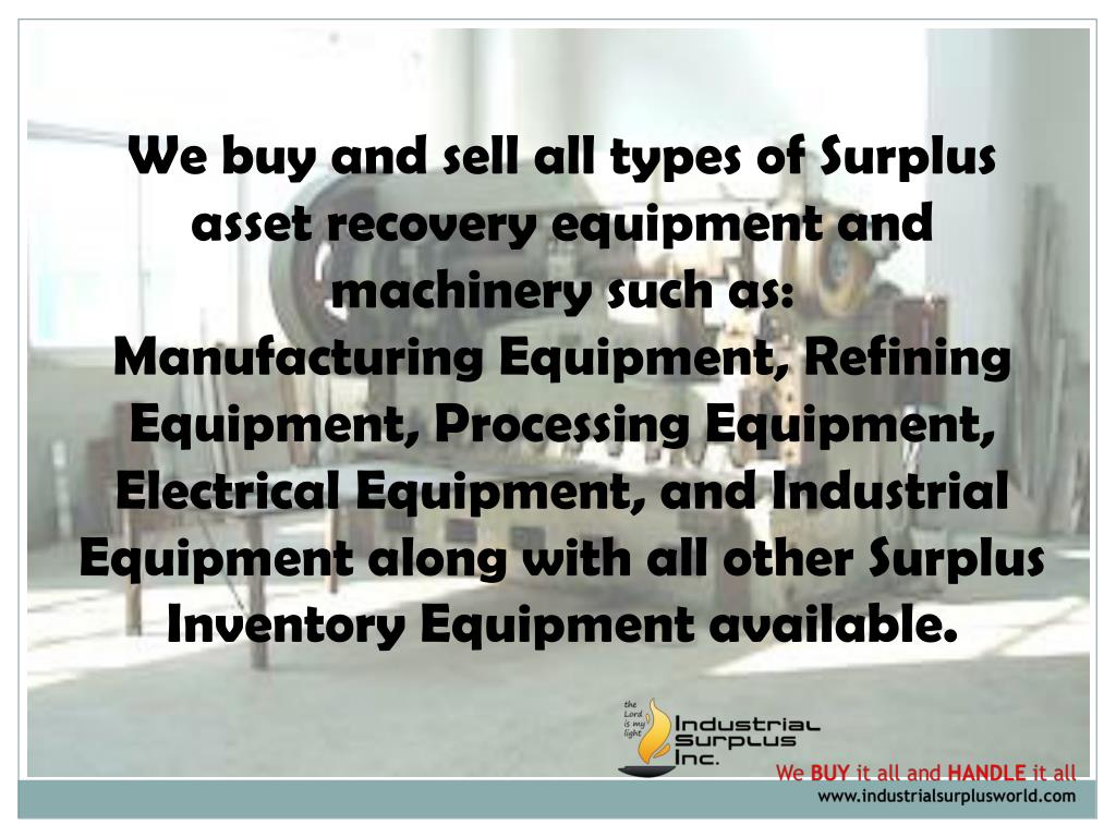 We buy and sell all types of Surplus asset recovery equipment and machinery such as:Manufacturing Equipment, Refining Equipment, Processing Equipment, Electrical Equipment, and Industrial Equipment along with all other Surplus Inventory Equipment available.