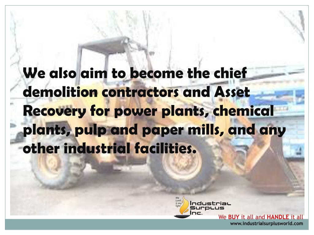 We also aim to become the chief demolition contractors and Asset Recovery for power plants, chemical plants, pulp and paper mills, and any other industrial facilities.