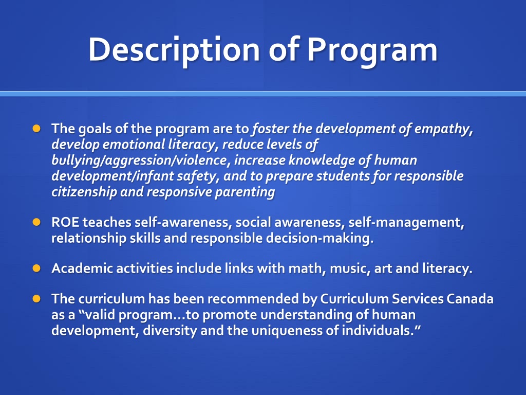 Description of Program • The goals of the program areto foster the development of empathy, develop emotional literacy, reduce levels of bullying/aggression/violence, increase knowledge of human development/infant safety, and to prepare students for responsible citizenship and responsive parenting • ROE teaches self-awareness, social awareness, self-management, relationship skills and responsible decision-making. • Academic activities include links with math, music, art and literacy. • The curriculum has been recommended by Curriculum Services Canada as a “valid program…to promote understanding of human development, diversity and the uniqueness of individuals.”