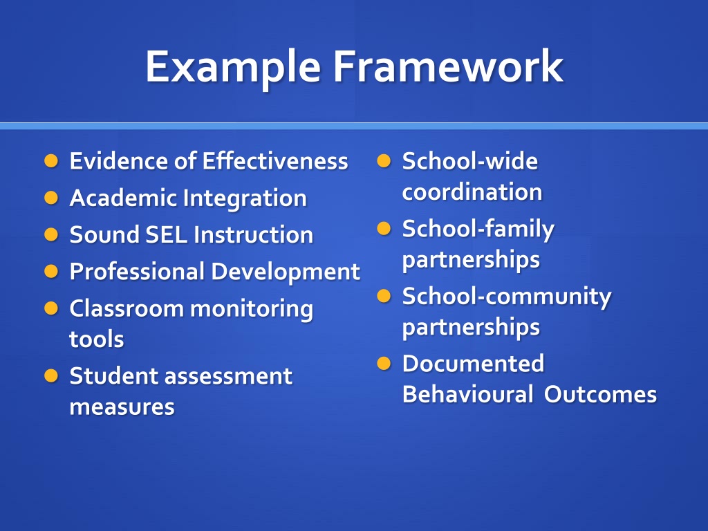 Example Framework School-wide coordination School-family partnerships School-community partnerships Documented Behavioural Outcomes • Evidence of Effectiveness • Academic Integration • Sound SEL Instruction • Professional Development • Classroom monitoring tools • Student assessment measures