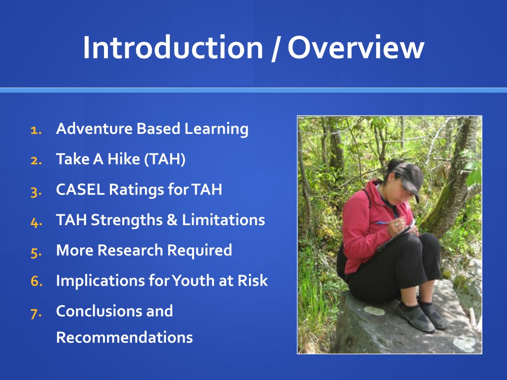 Introduction / Overview Adventure Based Learning Take A Hike (TAH) CASEL Ratings for TAH TAH Strengths & Limitations More Research Required Implications for Youth at Risk Conclusions and Recommendations