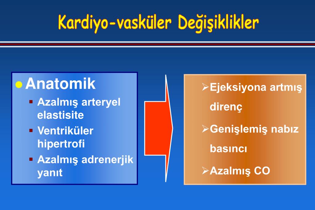 Kardiyo-vasküler Değişiklikler • Anatomik • Azalmış arteryel elastisite • Ventriküler hipertrofi • Azalmış adrenerjik yanıt • Ejeksiyona artmış direnç • Genişlemiş nabız basıncı • Azalmış CO