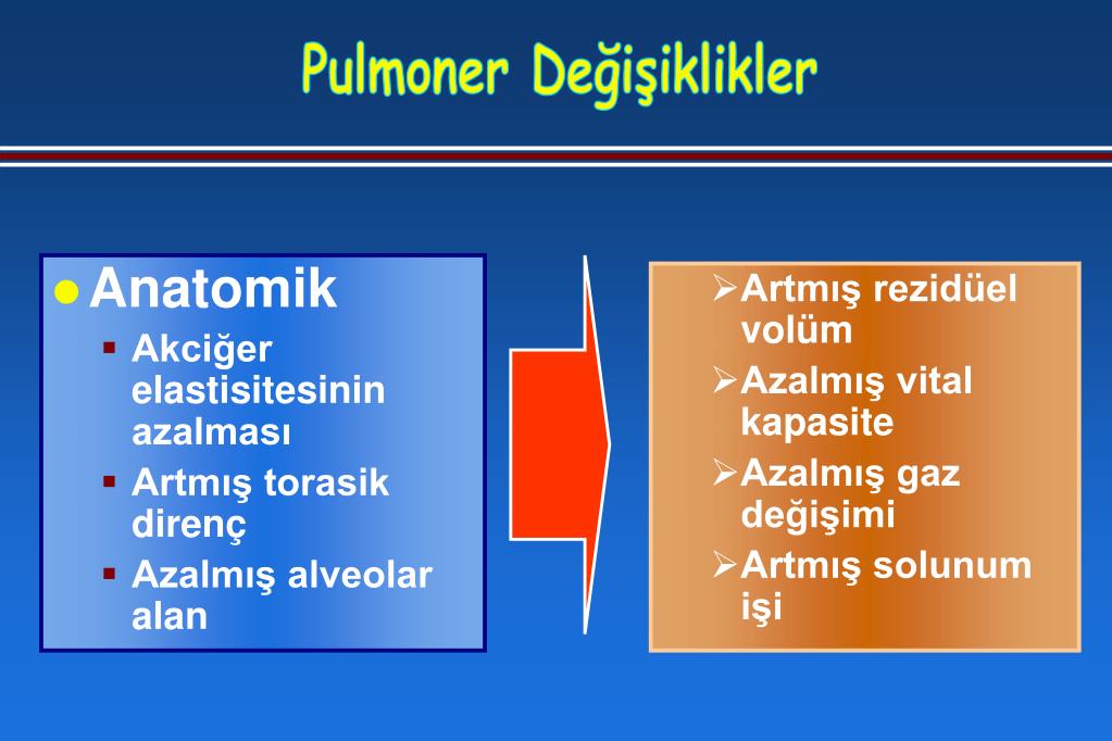 Anatomik • Akciğer elastisitesinin azalması • Artmış torasik direnç • Azalmış alveolar alan • Artmış rezidüel volüm • Azalmış vital kapasite • Azalmış gaz değişimi • Artmış solunumişi Pulmoner Değişiklikler