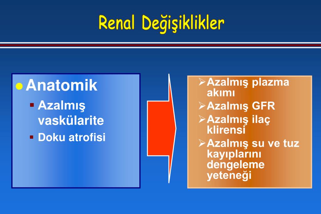 Anatomik • Azalmış vaskülarite • Doku atrofisi • Azalmış plazma akımı • Azalmış GFR • Azalmış ilaç klirensi • Azalmış su ve tuz kayıplarını dengeleme yeteneği Renal Değişiklikler
