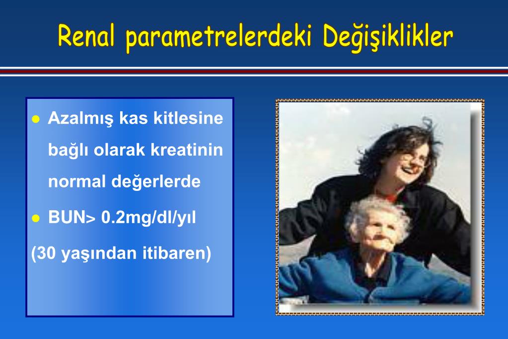 Azalmış kas kitlesine bağlı olarak kreatinin normal değerlerde BUN> 0.2mg/dl/yıl (30 yaşından itibaren) Renal parametrelerdeki Değişiklikler