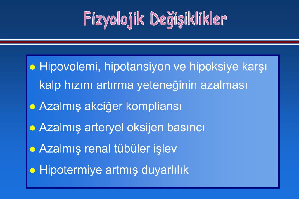 Fizyolojik Değişiklikler • Hipovolemi, hipotansiyon ve hipoksiye karşı kalp hızını artırma yeteneğinin azalması • Azalmış akciğer kompliansı • Azalmış arteryel oksijen basıncı • Azalmış renal tübüler işlev • Hipotermiye artmış duyarlılık