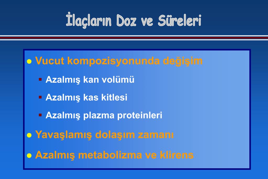 İlaçların Doz ve Süreleri • Vucut kompozisyonunda değişim • Azalmış kan volümü • Azalmış kas kitlesi • Azalmış plazma proteinleri • Yavaşlamış dolaşım zamanı • Azalmış metabolizma ve klirens