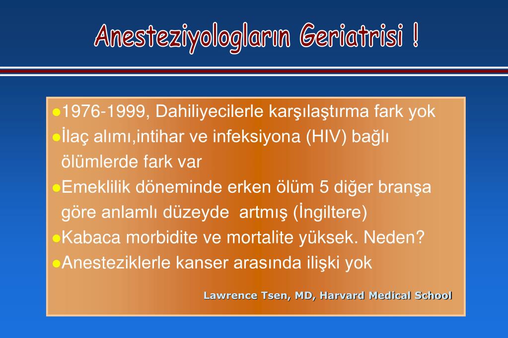 Anesteziyologların Geriatrisi ! • 1976-1999, Dahiliyecilerle karşılaştırma fark yok • İlaç alımı,intihar ve infeksiyona (HIV) bağlı ölümlerde fark var • Emeklilik döneminde erken ölüm 5 diğer branşa göre anlamlı düzeyde artmış (İngiltere) • Kabaca morbidite ve mortalite yüksek.Neden? • Anesteziklerle kanser arasında ilişki yok Lawrence Tsen, MD, Harvard Medical School