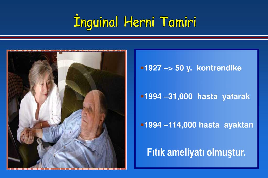 İnguinal Herni Tamiri • 1927 –> 50y. kontrendike • 1994 –31,000 hasta yatarak • 1994 –114,000 hasta ayaktan Fıtık ameliyatı olmuştur.