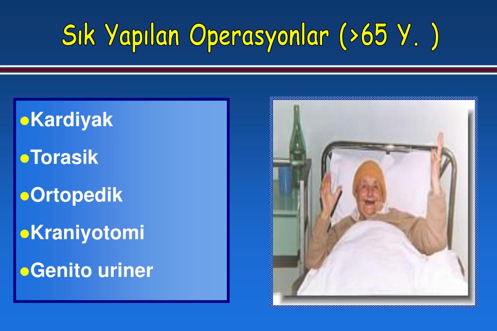 Sık Yapılan Operasyonlar (>65 Y. ) • Kardiyak • Torasik • Ortopedik • Kraniyotomi • Genito uriner