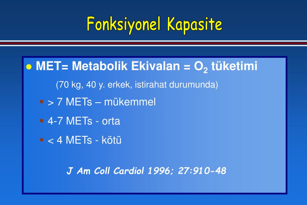Fonksiyonel Kapasite • MET= MetabolikEkivalan = O2 tüketimi (70 kg, 40 y.erkek, istirahat durumunda) • > 7 METs – mükemmel • 4-7 METs - orta • < 4 METs - kötü J Am Coll Cardiol 1996; 27:910-48
