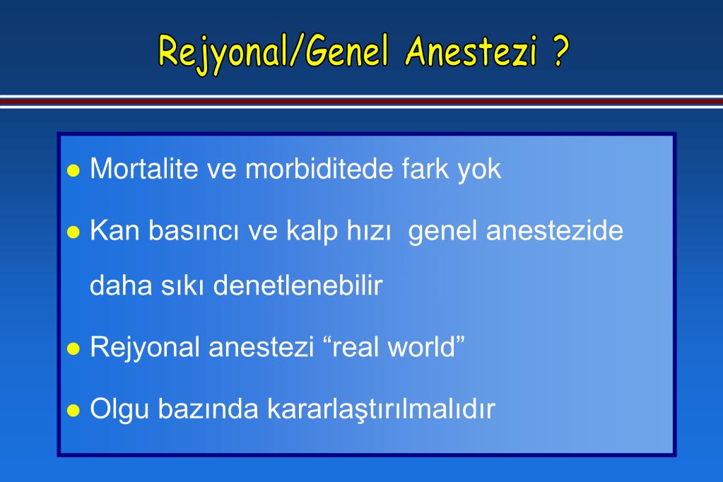 Rejyonal/Genel Anestezi ? • Mortalite ve morbiditede fark yok • Kan basıncı ve kalp hızı genel anestezide daha sıkı denetlenebilir • Rejyonal anestezi “real world” • Olgu bazında kararlaştırılmalıdır