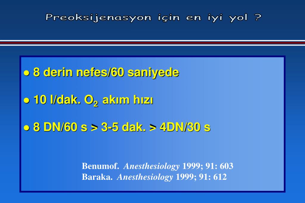 Preoksijenasyon için en iyi yol ? • 8 derin nefes/60 saniyede • 10 l/dak. O2 akım hızı • 8DN/60 s > 3-5 dak. > 4DN/30 s Benumof. Anesthesiology 1999; 91: 603 Baraka. Anesthesiology 1999; 91: 612