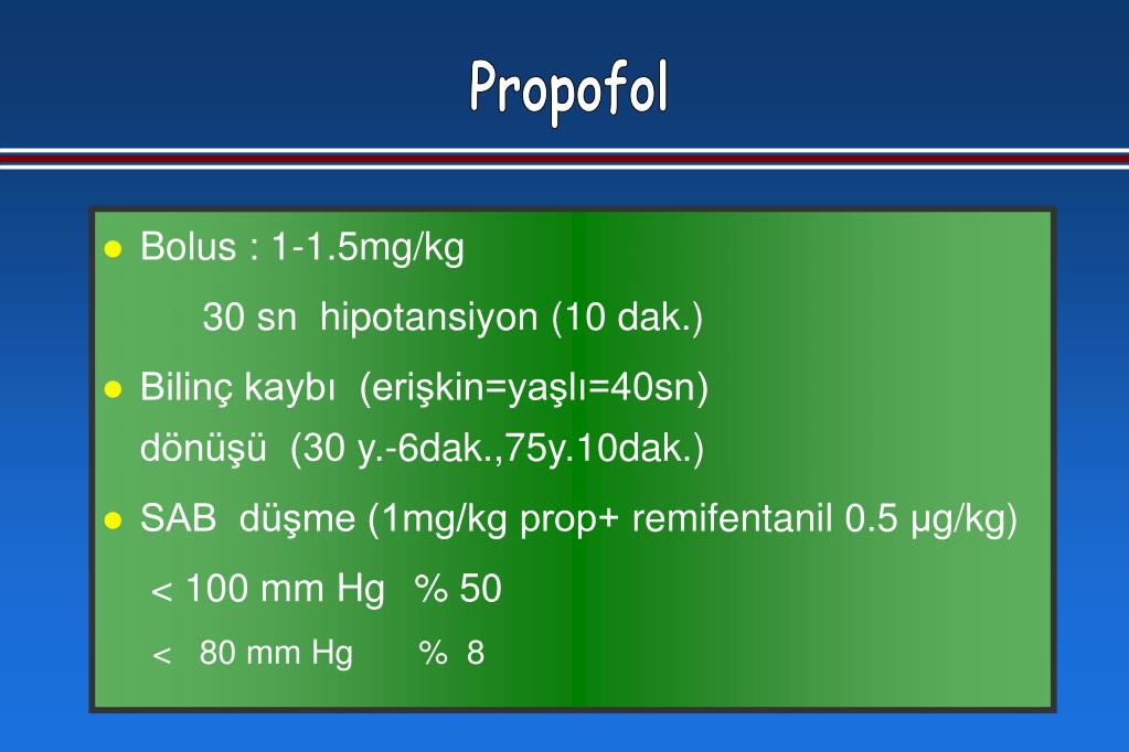 Propofol • Bolus : 1-1.5mg/kg 30sn hipotansiyon(10dak.) • Bilinç kaybı (erişkin=yaşlı=40sn) dönüşü (30y.-6dak.,75y.10dak.) • SAB düşme (1mg/kg prop+ remifentanil 0.5 μg/kg) < 100 mm Hg % 50 • < 80 mm Hg % 8