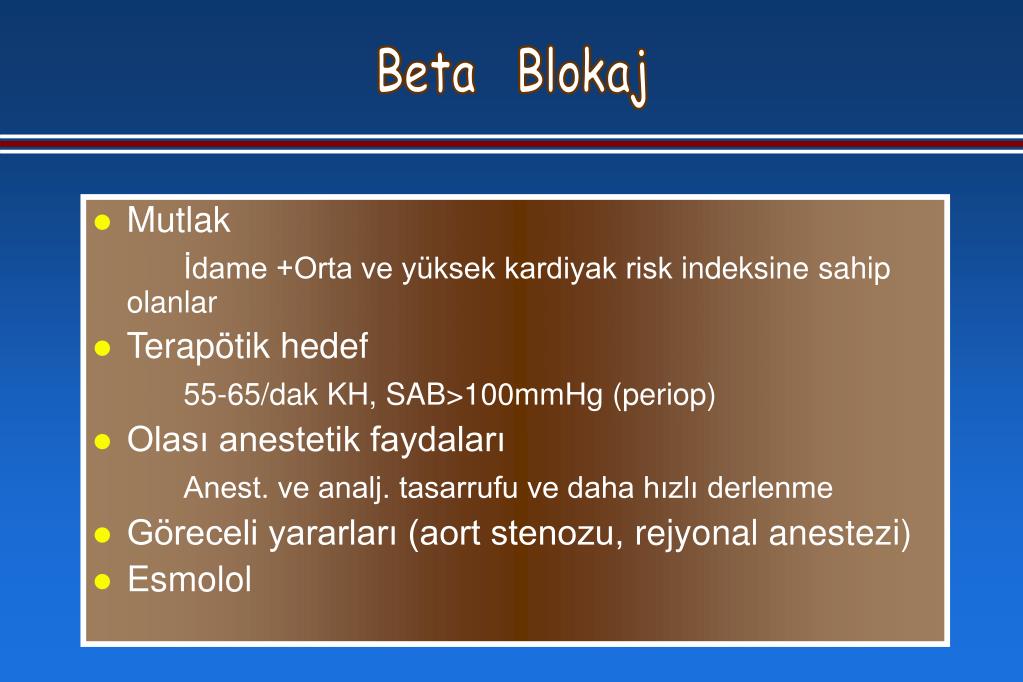 Beta Blokaj • Mutlak İdame +Orta ve yüksek kardiyak riskindeksine sahip olanlar • Terapötik hedef 55-65/dak KH, SAB>100mmHg (periop) • Olası anestetik faydaları Anest. ve analj. tasarrufu ve daha hızlı derlenme • Göreceli yararları (aort stenozu,rejyonal anestezi) • Esmolol