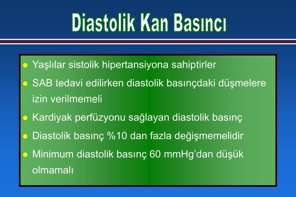Diastolik Kan Basıncı • Yaşlılar sistolik hipertansiyona sahiptirler • SAB tedavi edilirken diastolik basınçdaki düşmelere izin verilmemeli • Kardiyak perfüzyonu sağlayan diastolik basınç • Diastolik basınç %10 dan fazla değişmemelidir • Minimum diastolik basınç 60mmHg’dan düşük olmamalı