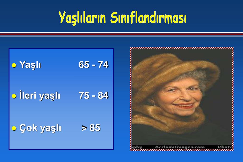 Yaşlı 65 - 74 İleri yaşlı 75 - 84 Çok yaşlı >85 Yaşlıların Sınıflandırması