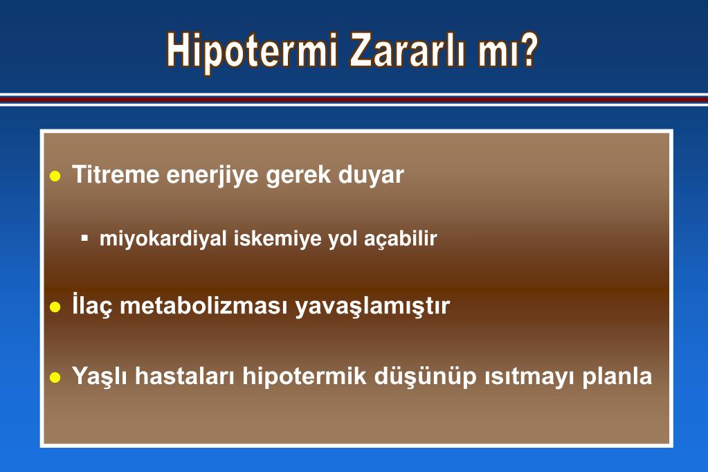 Hipotermi Zararlı mı? • Titreme enerjiye gerek duyar • miyokardiyal iskemiye yol açabilir • İlaç metabolizması yavaşlamıştır • Yaşlı hastaları hipotermik düşünüp ısıtmayı planla