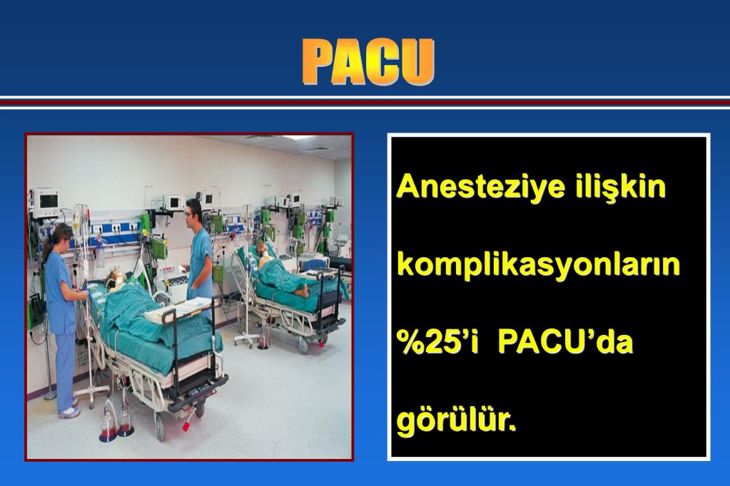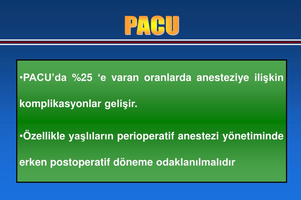 PACU • PACU’da %25 ‘e varan oranlarda anesteziye ilişkin komplikasyonlar gelişir. • Özellikle yaşlıların perioperatif anestezi yönetiminde erken postoperatif döneme odaklanılmalıdır