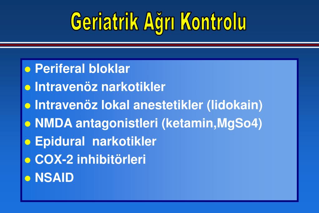 Geriatrik Ağrı Kontrolu • Periferal bloklar • Intravenöz narkotikler • Intravenöz lokal anestetikler (lidokain) • NMDA antagonistleri (ketamin,MgSo4) • Epidural narkotikler • COX-2 inhibitörleri • NSAID