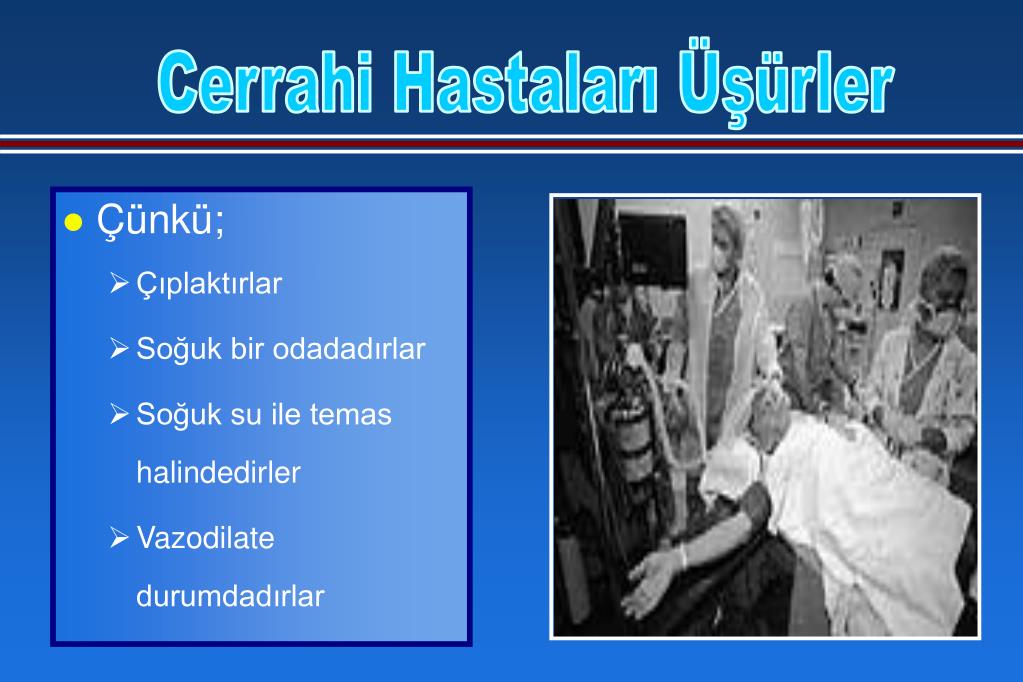 Cerrahi Hastaları Üşürler • Çünkü; • Çıplaktırlar • Soğuk bir odadadırlar • Soğuk su ile temas halindedirler • Vazodilate durumdadırlar