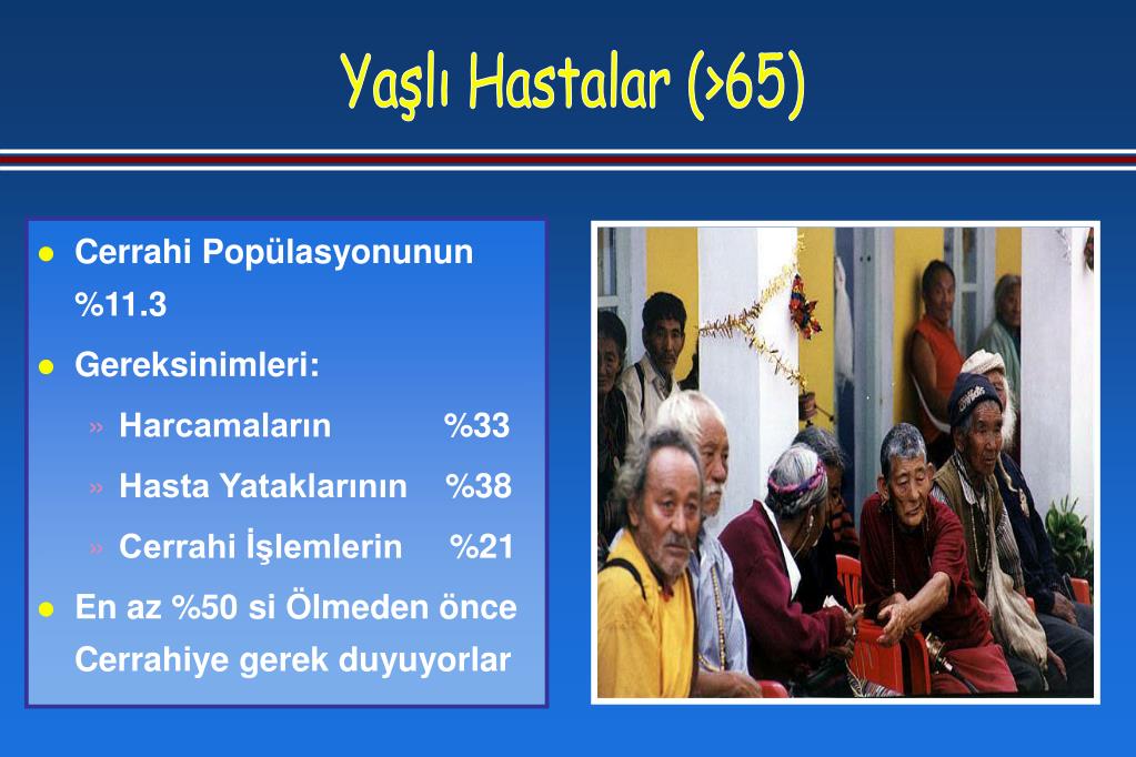 Cerrahi Popülasyonunun%11.3 Gereksinimleri: Harcamaların %33 Hasta Yataklarının %38 Cerrahi İşlemlerin %21 En az %50 si Ölmeden önce Cerrahiye gerek duyuyorlar Yaşlı Hastalar (>65)