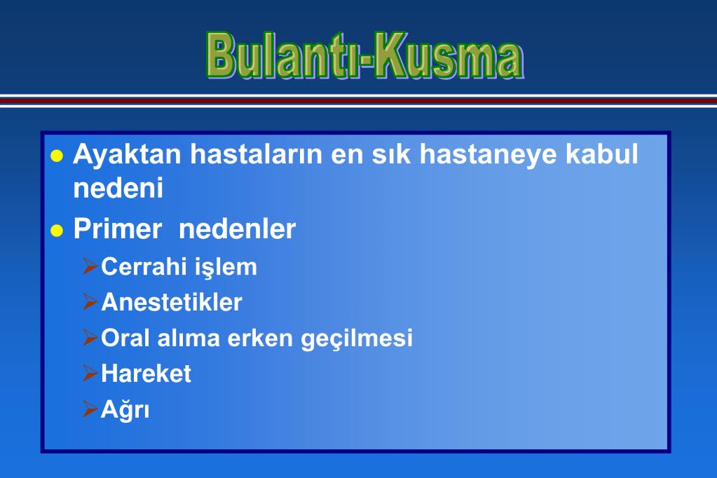 Bulantı-Kusma • Ayaktan hastaların en sık hastaneye kabul nedeni • Primer nedenler • Cerrahi işlem • Anestetikler • Oral alıma erken geçilmesi • Hareket • Ağrı
