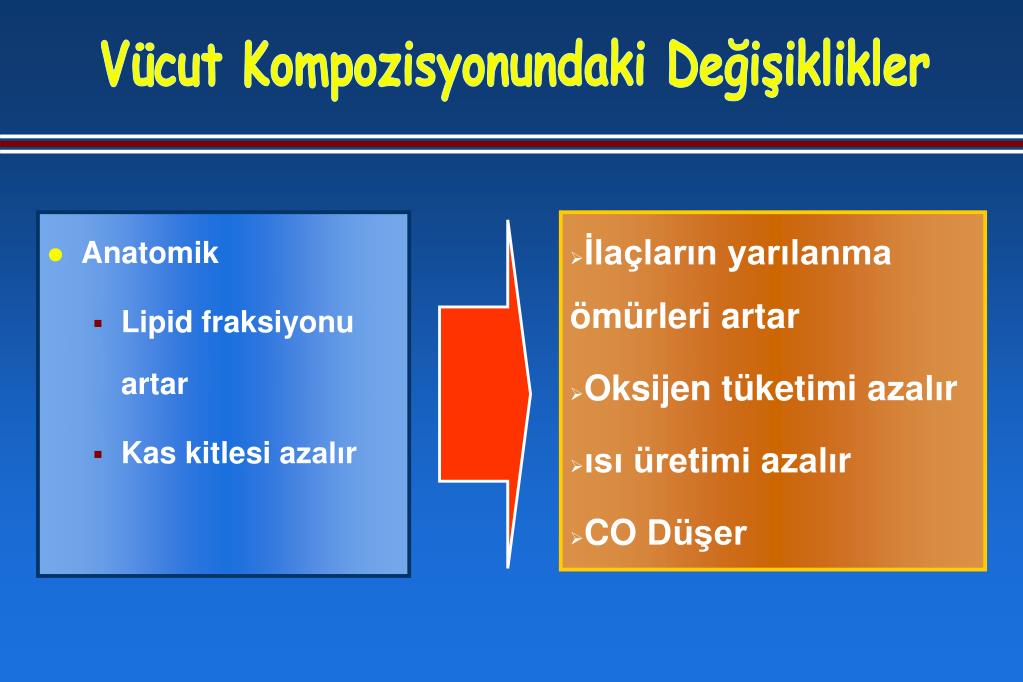 Anatomik Lipid fraksiyonu artar Kas kitlesi azalır Vücut Kompozisyonundaki Değişiklikler • İlaçların yarılanma ömürleri artar • Oksijen tüketimi azalır • ısı üretimi azalır • CO Düşer