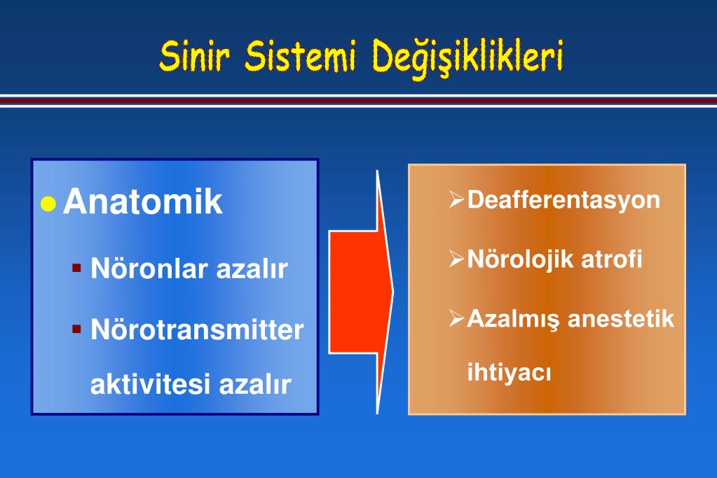Anatomik Nöronlar azalır Nörotransmitter aktivitesi azalır Sinir Sistemi Değişiklikleri • Deafferentasyon • Nörolojik atrofi • Azalmış anestetik ihtiyacı
