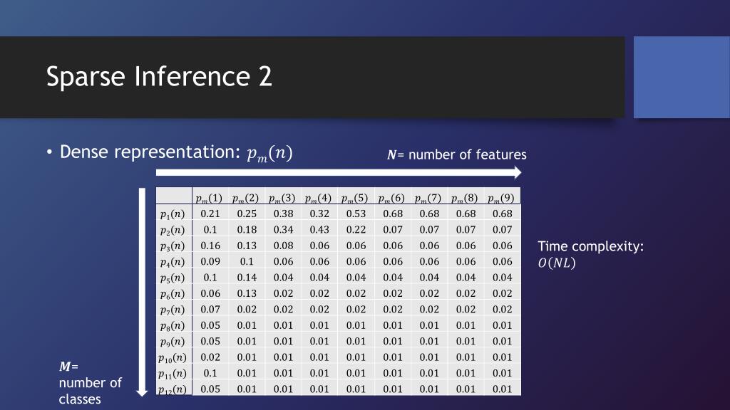 Sparse Inference 2 • Dense representation: = number of features Time complexity: = number of classes
