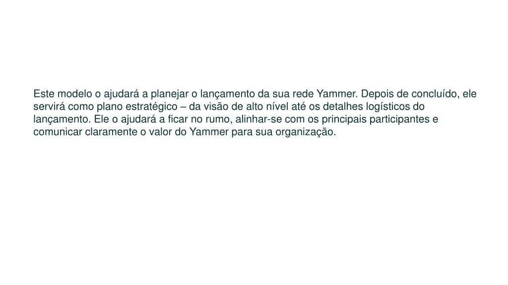 Este modelo o ajudará a planejar o lançamento da sua rede Yammer. Depois de concluído, ele servirá como plano estratégico – da visão de alto nível até os detalhes logísticos do lançamento. Ele o ajudará a ficar no rumo, alinhar-se com os principais participantes e comunicar claramente o valor do Yammer para sua organização.