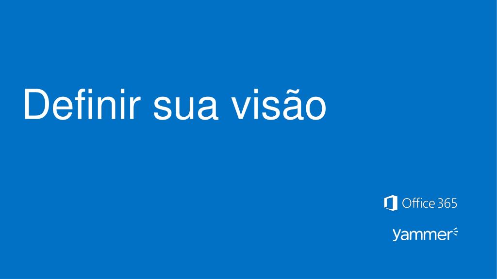 O que é uma declaração de visão? Declaração de visão é umadescrição com 1-4 sentençasque define o valor do Yammer parasuaempresaeseusfuncionários. As declarações de visãoajudamseuscolegas de trabalho e líderes a entenderosbenefícios do Yammer, o que é fundamental paraobtersuaadesão e seuapoio. Exemplos de declarações de visão Transformara forma comonossodepartamento se conecta, trabalhaemconjuntoemtarefasouprojetos, se comunica com a liderança e simplificarprocessosparamelhorar a eficiência e a clareza. Nóscriamosumaplataforma de colaboraçãoaberta e seguraparacompartilharfacilmente dados enotíciasda empresa entre funcionários, aperfeiçoandoassim a execuçãoeficiente de nossasestratégiascomo parte de nossacultura de desempenho.