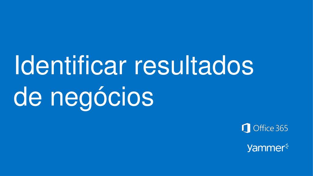 Por que identificar resultados de negócios? Definirresultados de negóciosclarosajudaa concentrarseusesforçosemmetaspráticasque o Yammer podeajudá-lo a alcançar. Aoesboçarosresultados de negócios, pensenapossibilidade de envolverlíderes da empresae membros de departamentosprioritários. Exemplos de resultados de negócios Recursoshumanos Acelere o processo de ambientação. Aumente a retenção de funcionários. Crieumaculturaunificada. • Vendas • Crie uma experiência unificada para todos os clientes, em todas as linhas de produtos e regiões geográficas. • Acelere o ciclo de venda. • Compartilhe informações sobre a concorrência mais rápido. • Marketing • Fique conectado com aquilo que os clientes estão pensando. • Acelere a execução de campanhas, e manuais e acessórios • Colabore com as agências de perto e com segurança.