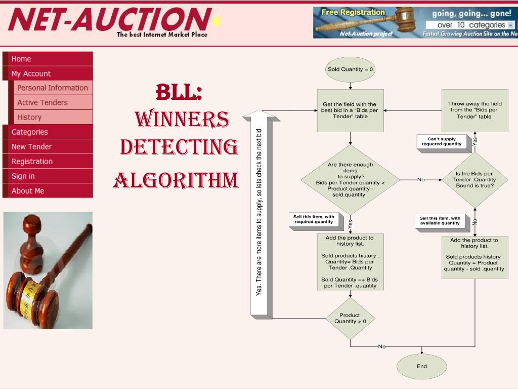 Abstract • Net-Auctionis an implementation of web auction, like eBay, Sotheby, and others with it’s own design and bid politics. • This web site have an intuitive interface and unique visual objects that make it friendly for use. • Common client operations were implemented in this application. In addition, there were used some original marketing solutions.