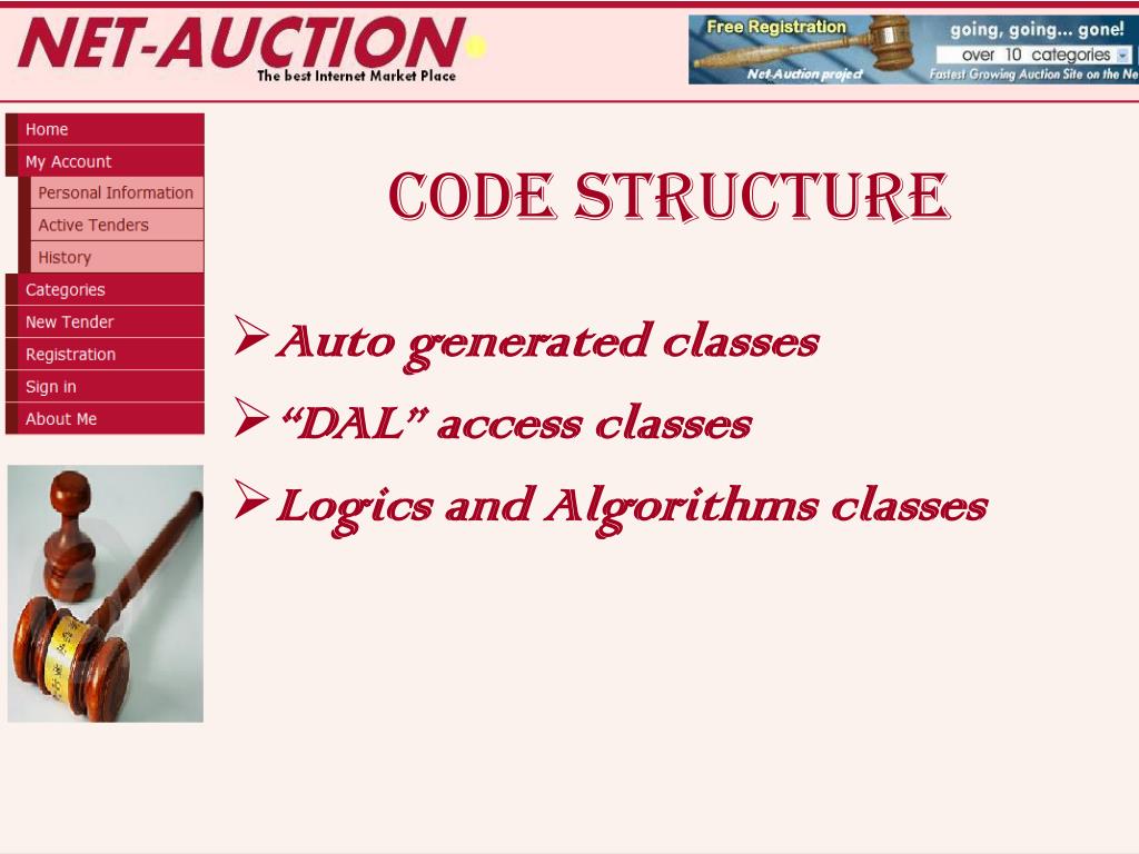 Code structure • Auto generated classes • “DAL” access classes • Logics and Algorithms classes
