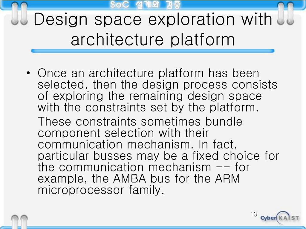 Design space exploration with architecture platform • Once an architecture platform has been selected, then the design process consists of exploring the remaining design space with the constraints set by the platform. These constraints sometimes bundle component selection with their communication mechanism. In fact, particular busses may be a fixed choice for the communication mechanism -- for example, the AMBA bus for the ARM microprocessor family.