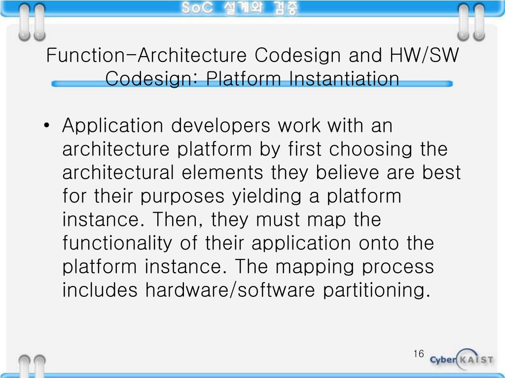 Function-Architecture Codesign and HW/SW Codesign: Platform Instantiation • Application developers work with an architecture platform by first choosing the architectural elements they believe are best for their purposes yielding a platform instance. Then, they must map the functionality of their application onto the platform instance. The mapping process includes hardware/software partitioning.