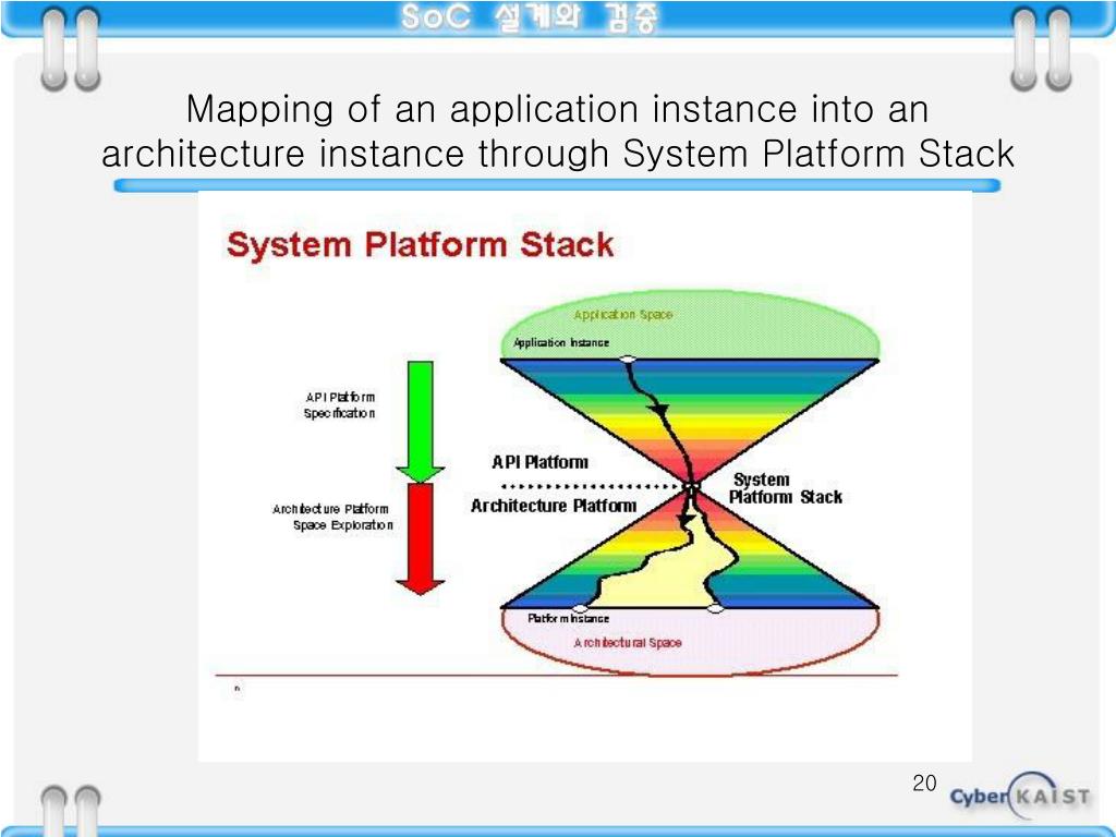 Architecture platform design • "design" of an architecture platform is a trade-off in a complex space that includes: • The size of the application space that can be supported by the architectures belonging to the architecture platform. This represents the flexibility of the platform. • The size of the architecture space that satisfies the constraints embodied in the architecture platform definition. This represents the degrees of freedom that architecture providers have in designing their hardware instances.
