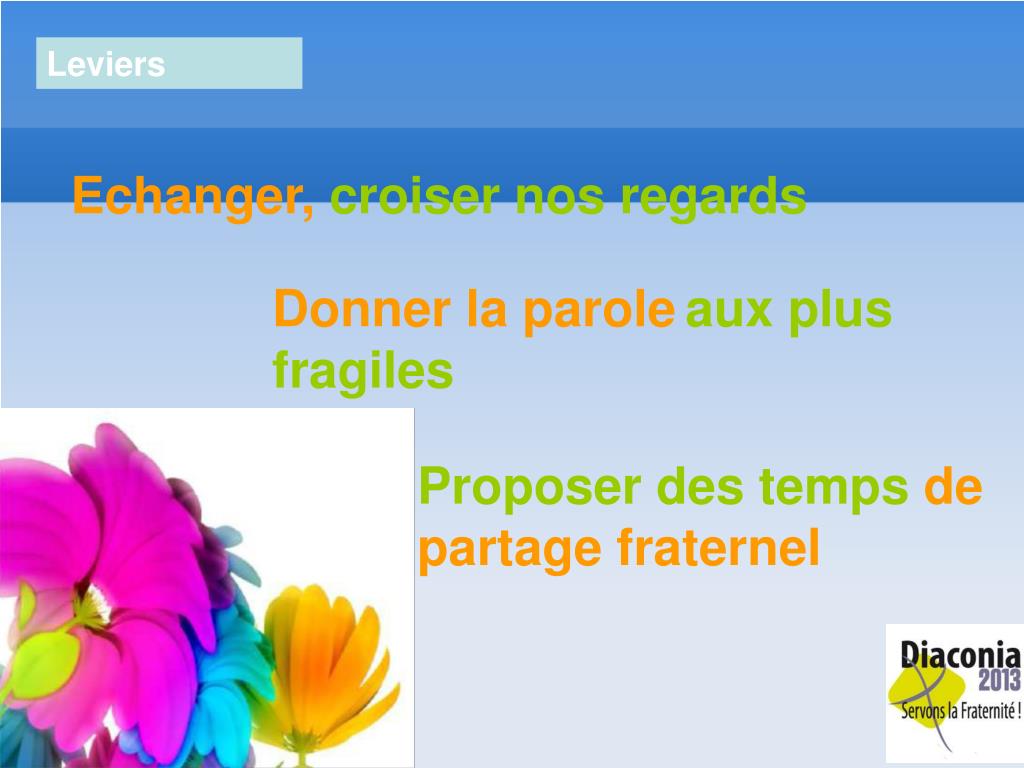 Leviers Echanger, croiser nos regards Donner la paroleaux plus fragiles Proposer des temps de partage fraternel