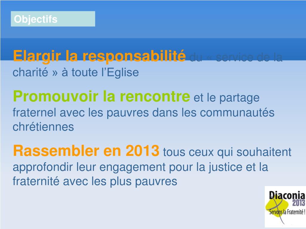 Objectifs Elargir la responsabilité du « service de la charité » à toute l’Eglise Promouvoir la rencontre et le partage fraternel avec les pauvres dans les communautés chrétiennes Rassembler en 2013 tous ceux qui souhaitent approfondir leur engagement pour la justice et la fraternité avec les plus pauvres