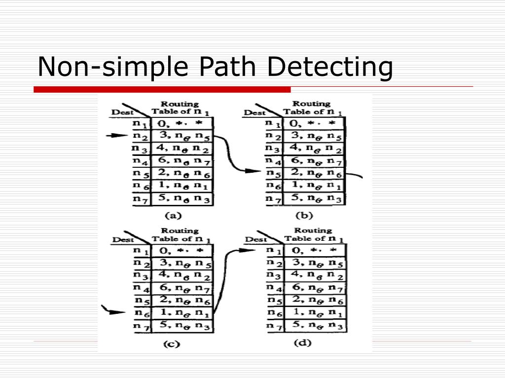 Protocols with non-simple path detecting • Detect whether the neighbor is in the path that will be offer to the neighbor • Tag each routing table entry with sequence number,so nodes can distinguish the stale one from the new one.