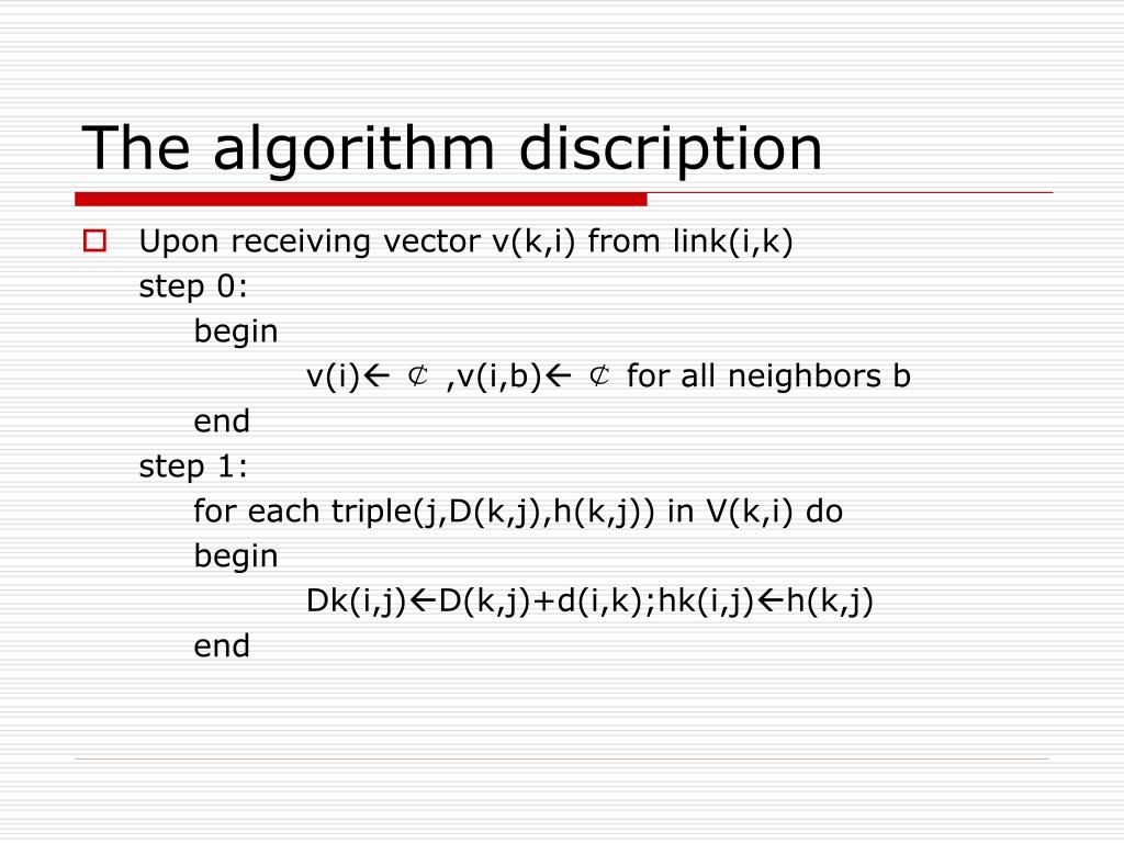 The algorithm discription • Upon receiving vector v(k,i) from link(i,k) step 0: begin v(i) ¢ ,v(i,b) ¢ for all neighbors b end step 1: for each triple(j,D(k,j),h(k,j)) in V(k,i) do begin Dk(i,j)D(k,j)+d(i,k);hk(i,j)h(k,j) end